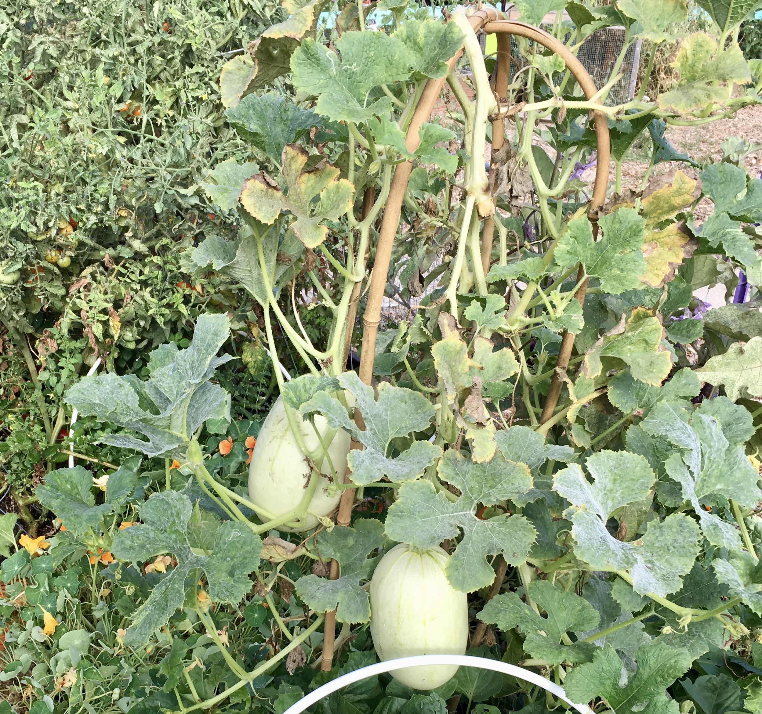 Winter squashes are more nutritious and hardier than summer squashes, being rich in fiber, antioxidants, vitamins, and minerals. Pumpkins seeds are particularly rich in protein and beneficial oils. Planting the squash with supports, like in the spaghetti squash in the picture, allows them to be planted closer to other veggies and keeps them off the ground. Native Americans planted them with corn and beans and called them the Three Sisters. When they are grown together, their roots nourish each other with compatible nutrients. These foods are also nutritionally balanced with vitamins, protein, and fiber. You can train vigorous climbing varieties along a wire fence or trellis. Winter squashes must be fully ripe for the best flavor, with a tough skin that can’t be dented with a fingernail for storage. Kids can cut the ripe squash from the vine, leaving the stem attached, cure for 2 weeks in a warm place, and store in a cool place for up to 6 months.