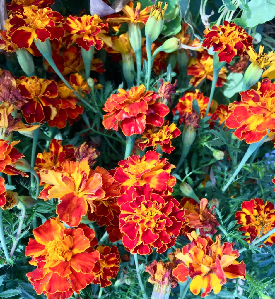 Plants have natural defenses and release chemicals into the air, sending messages through their roots and symbiotic mycorrhizal organisms to attract beneficial insects. Neighboring plants also react to pest threats and release more chemicals and antioxidants into their fruits that are beneficial to the human diet. Planting onions, hot peppers, garlic, dill, and mint as well as marigolds and nasturtiums helps to prevent aphids, beetles, caterpillars, and rodents. Companion planting attracts pollinators and repels pests by closely intercropping beneficial plants of different sizes among your veggies. Because nasturtiums and marigolds grow lovely colorful blossoms all summer long and bugs dislike their smell and avoid anything growing around them, they are good companions to plant among your veggies. They like full sun and grow well in pots for patio gardening.