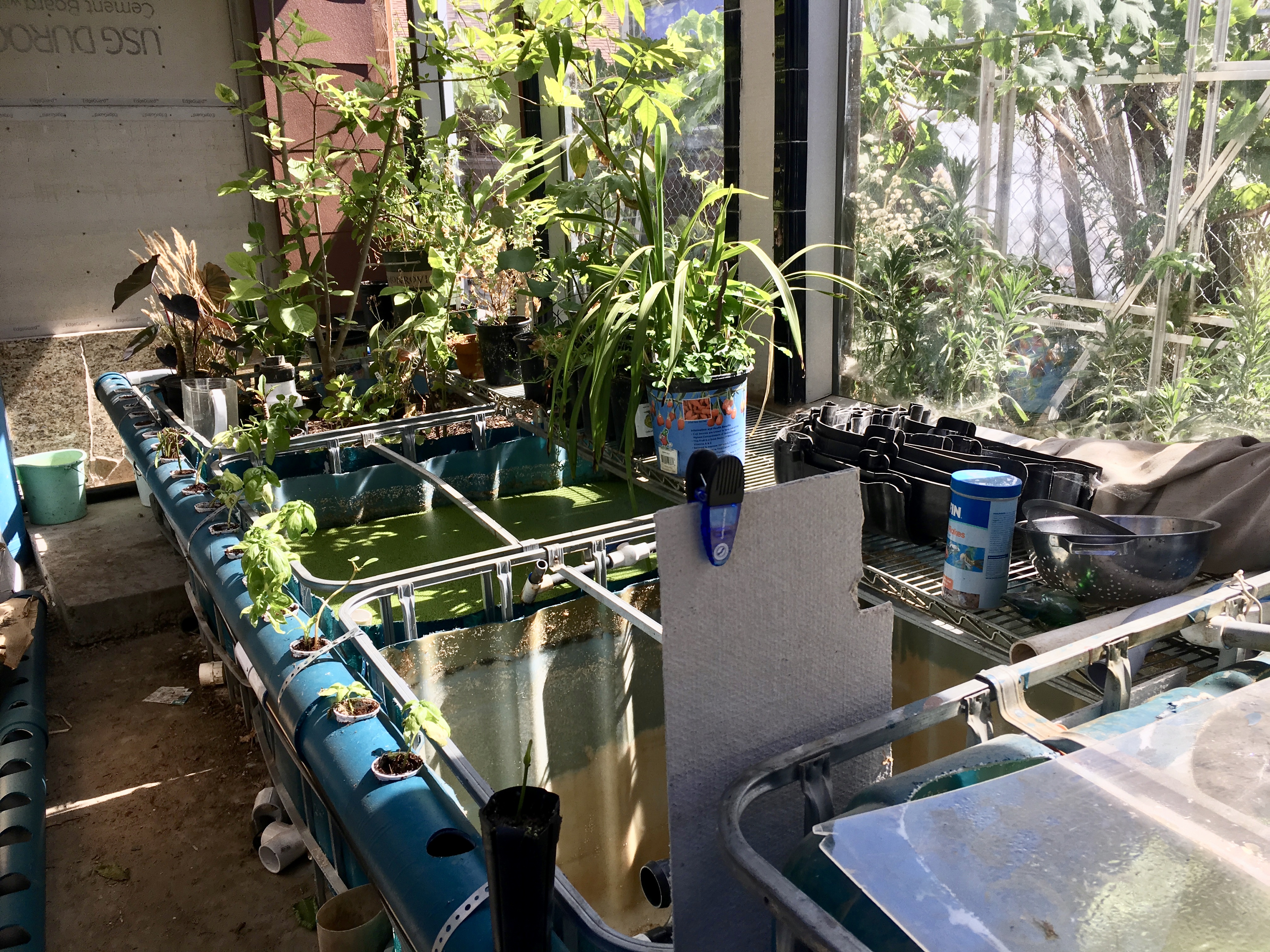 Local native fish are best for outside aquaponic gardens and are low maintenance. In addition to commercial feed, it is a good idea to plant Duckweed, a fast growing aquatic plant, rich in nutrients, that doubles its mass every other day. Plant it in a separate tank to feed the fish with fresh food. Fill the grow beds with gravel or expanded clay pellets and lots of red wriggler worms, who along with the bacteria transform the fish waste into plant food. An aquaponic garden produces food naturally without chemicals, recycles the water, and is environment friendly.