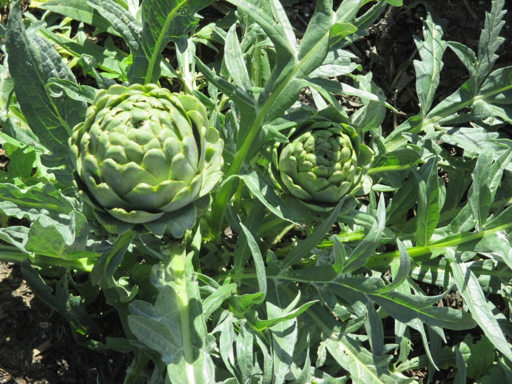 Artichokes are perennial veggies in California and other warm climates, where they grow 3 to 5 feet tall and look lovely in the landscape. Artichokes can be propagated by seed or by slicing a 10” sucker from the parent plant with a section of the root in rich composted soil. Their roots go down 4 feet and they grow well with asparagus, cabbage, beets, and lettuce. In the fall, prune the plants to the ground. When the artichoke head is still closed and about the size of an orange, cut the stem a couple of inches below the head. If the head is not harvested, the bud will blossom into a beautiful purple-blue flower.