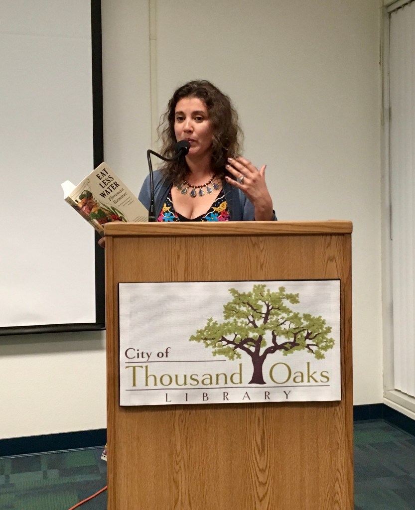 Florencia Ramirez was the speaker at the Organic Garden Club of Ventura County’s November meeting. Her book, “Eat Less Water,” is about saving water, building soil, and cooking from scratch with organic ingredients. Her dedication to saving water started during one of California’s droughts when she read tips on saving water. She thought about inventing a shower timer that encourages people to take shorter showers and found an Australian product that did just that. She imported it and sold 80,000 units.