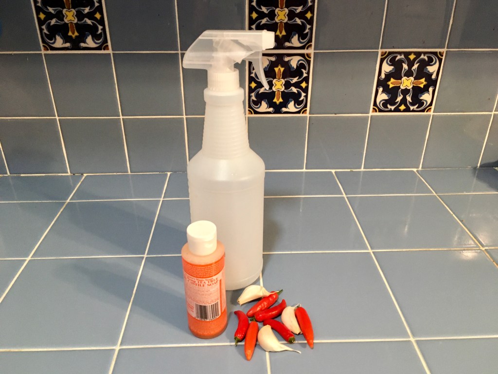 Put 2 quarts of water in a saucepan. Add 3 crushed cloves of garlic and 6 hot peppers and boil for 5 minutes. Let steep overnight. Strain through a cheesecloth or an old T-shirt, pour into a plastic spray bottle, and add a teaspoon of pure soap, like Dr. Bronner’s Castile soap. Squirt onto any infested plants. Use this homemade bug spray to protect your veggie garden and respray to keep those grasshoppers away from your salad greens!