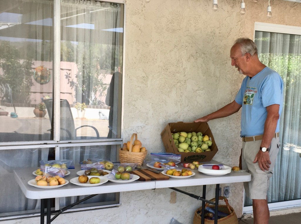 Bill Brandt, Past President of the Organic Garden Club of Ventura County and the California Rare Fruit Growers of Los Angeles, has over 50 varieties of apples growing in his yard! He grafted several trees with 7 – 12 varieties! He can harvest apples throughout the year! On the table are all his apple varieties now ripe! Plus his pears and mangoes! Our photographer, Scott Horn, filmed the following video segment on his apple varieties.