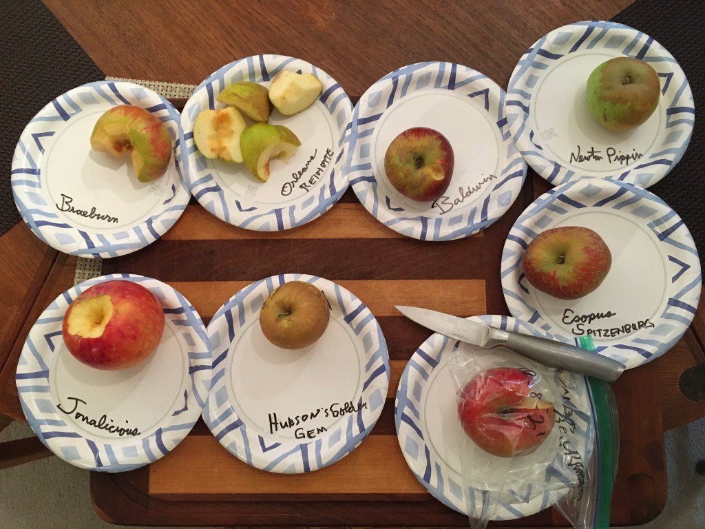 At our recent Organic Garden Club Board Meeting, Bill brought eight different varieties of apples harvested from two multiple grafted apple trees in his backyard. Varieties included: Newton Pippin, Baldwin, Orlean’s Reinette, Hudson’s Golden Gem, Esopus Spitzenberb, Kid’s Orange into Red (sibling of Gala), Braeburn, and Jonalicious. Every time we have a tasting, there is a different favorite variety; this time, it was Jonalicious!
