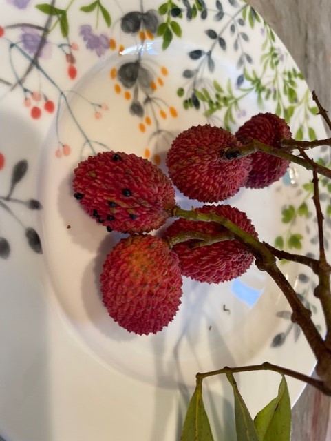 Bill’s lychee tree has Bengal and Brewster varieties. Both do well in Southern California. Lychee fruit taste sweet with a citrus note and a floral flavor. Peal back the skin to eat the treat.