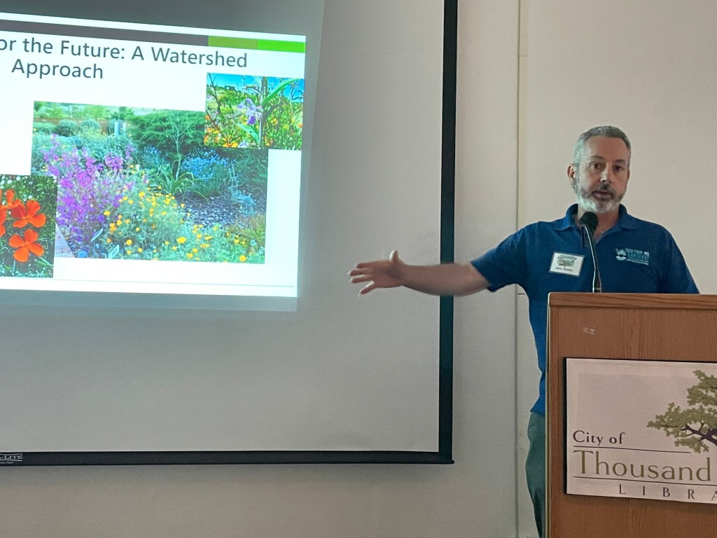 The City of Thousand Oaks has 12 million square feet of city landscaping to maintain. It is in transition as they are taking out old landscaping and old irrigation systems. They are also only watering one day a week. They are adding 4-6” of mulch in many areas. They are preparing to remove dead plants before the Santa Ana winds come this fall. The city has a water truck that is watering the oak trees. It’s on about a 10-day rotation.