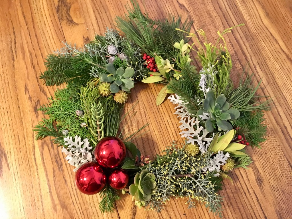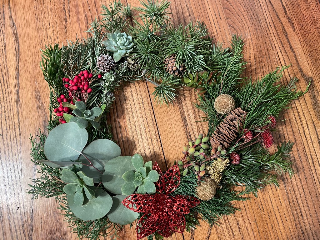 Gathering the supplies for your wreath is an adventure in nature. Your garden has healing powers when you approach your search with awareness in the present moment, appreciating its beauty. You may find treasures lying about in your backyard, neighborhood park, nearby forest, or Christmas tree lot. Eucalyptus pods, succulents, and dried flowers make fun additions.