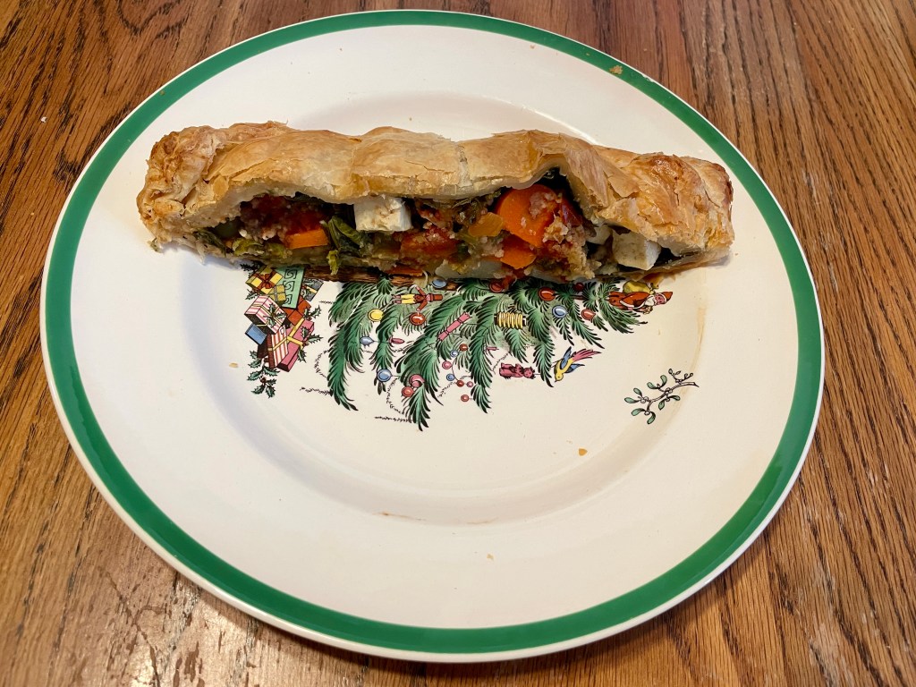 Ingredients: Slice 8 oz of organic mushrooms, 1 celery, and 1 carrot. Chop ¼ cup onion, 1 clove garlic, ¼ cup green pepper, 1 large red potato, ½ delicate squash, and 8 oz garden greens (like kale, mustards, Swiss chard, bok choy, mizuna, spinach). Cube 8 oz organic sprouted tofu. Cut fresh from the garden rosemary, sage, parsley, marjoram, dill, and oregano. Strain a 14.5 oz can of organic roasted tomatoes and green chiles. Add 2 oz organic bread crumbs and ¼ tsp sea salt. Brush 2 oz milk on 2 puff pastry sheets.