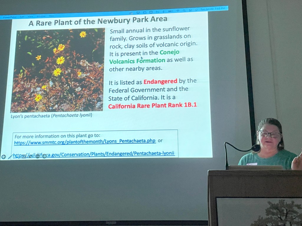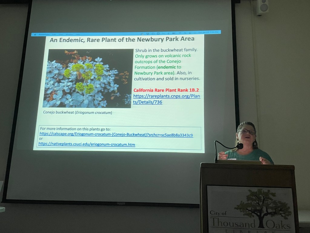 At our January meeting, Terri Burgess, Chapter Membership and Outreach Coordinator of our local California Native Plant Society, told us of the importance of protecting native plants from extinction and their role in our local ecosystem of plants, insects, and animals. California has unique native plants and some rare native plants live only on the volcanic soils in Newbury Park!