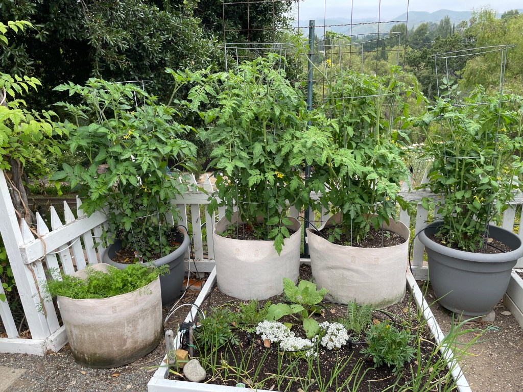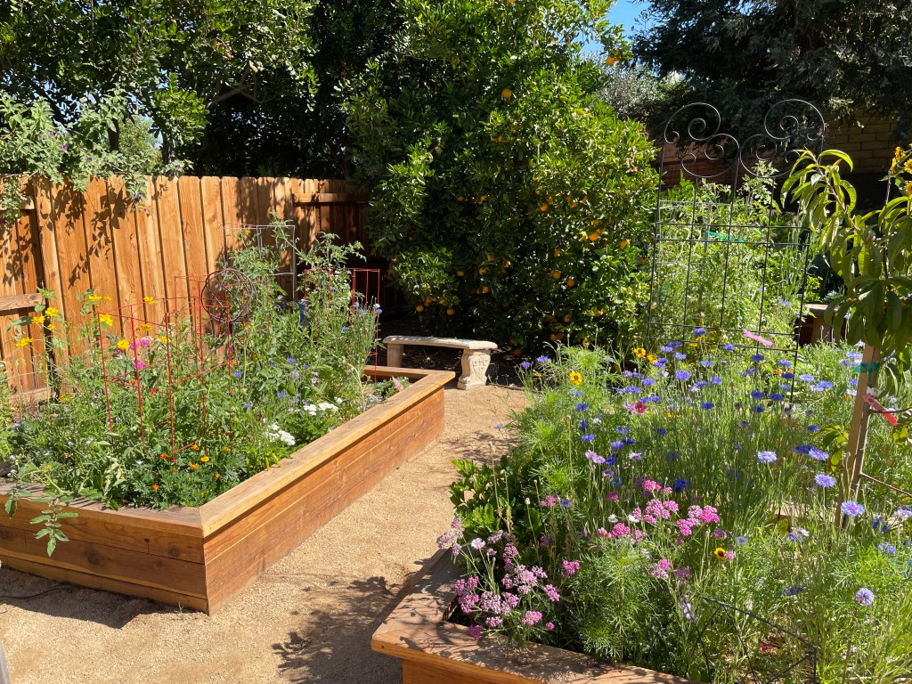 Growing your food in raised beds give you a longer growing season, easier on your back gardening, healthier soil and plants, and more availability. These metal raised garden beds were filled with wood chips on the bottom half of the beds. Next green pruning scraps, dried leaves, and cardboard were added, followed by biochar, worm castings, and coffee grinds. Then, several bags of certified organic raised bed potting mix was pour in and topped with homemade compost. Now the raised beds are ready to plant your herbs, flowers, and veggies.