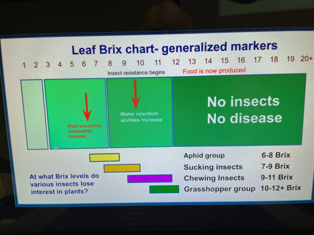 Michael uses a refractometer to measure the sugar level. The leaf is the factory for the plant, while the below ground activity is just the supply chain. The higher nutrient densities make it hard for insects to digest. Plants create their own immunity.