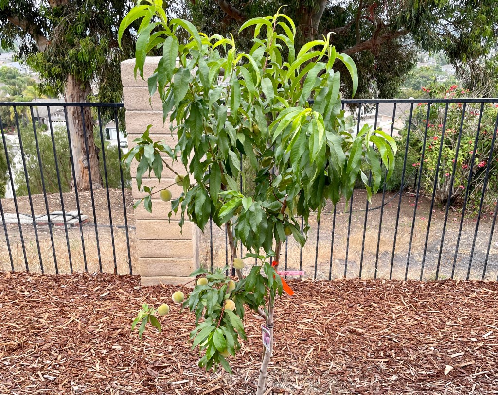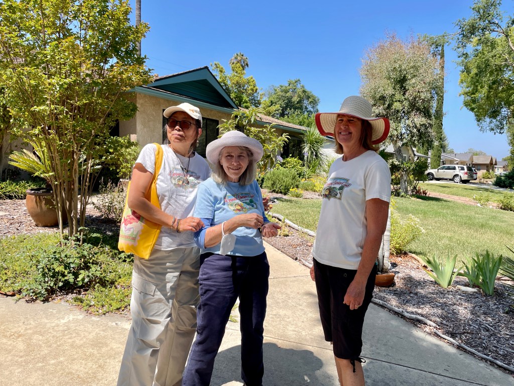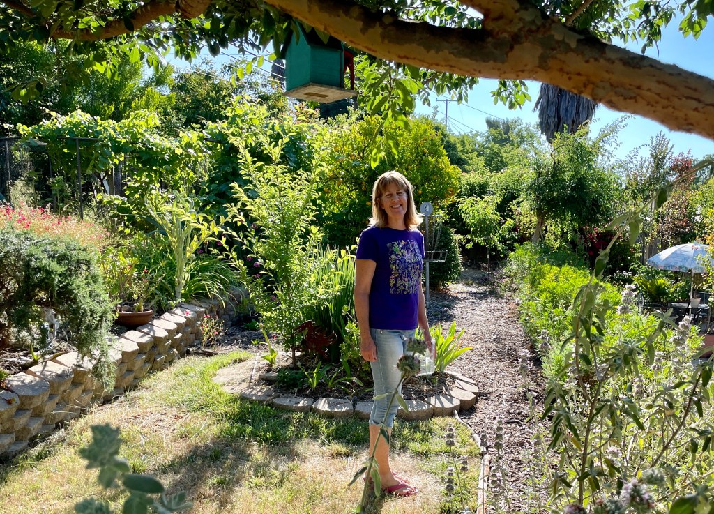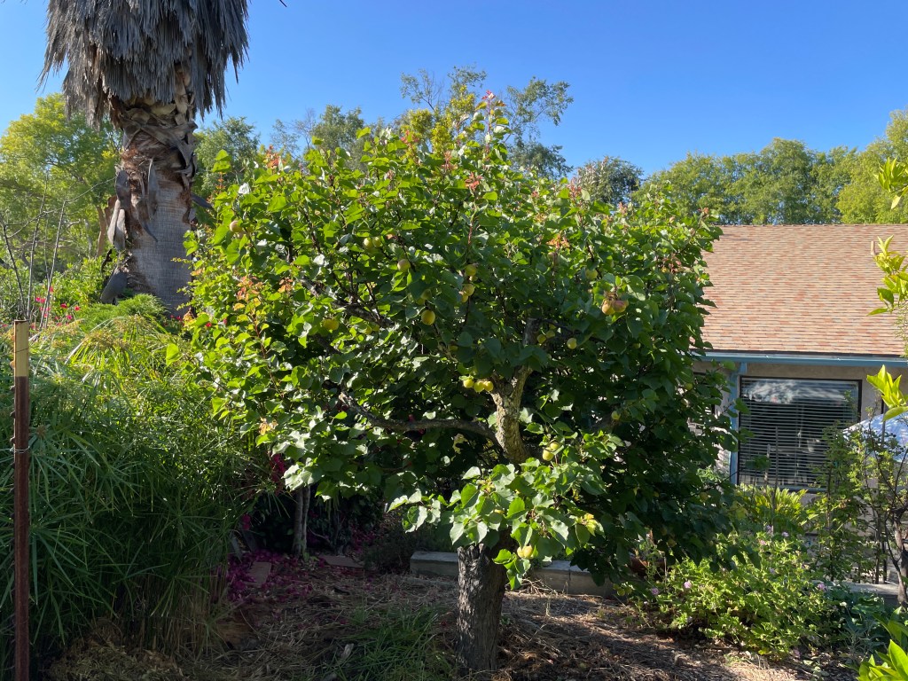 Sue Byrne’s orchard was the second garden on our Tour with fruit trees in the front, side, and back yards: nectarine, apricot, Navel orange, Gorgon apple, Valencia orange, fig, plum, lemon, and loquat. One of her apple trees has 3 varieties, including Anna and Einshimer, grafted on one root stock!