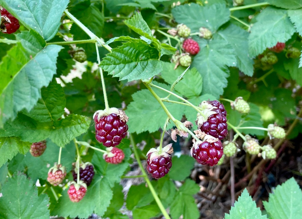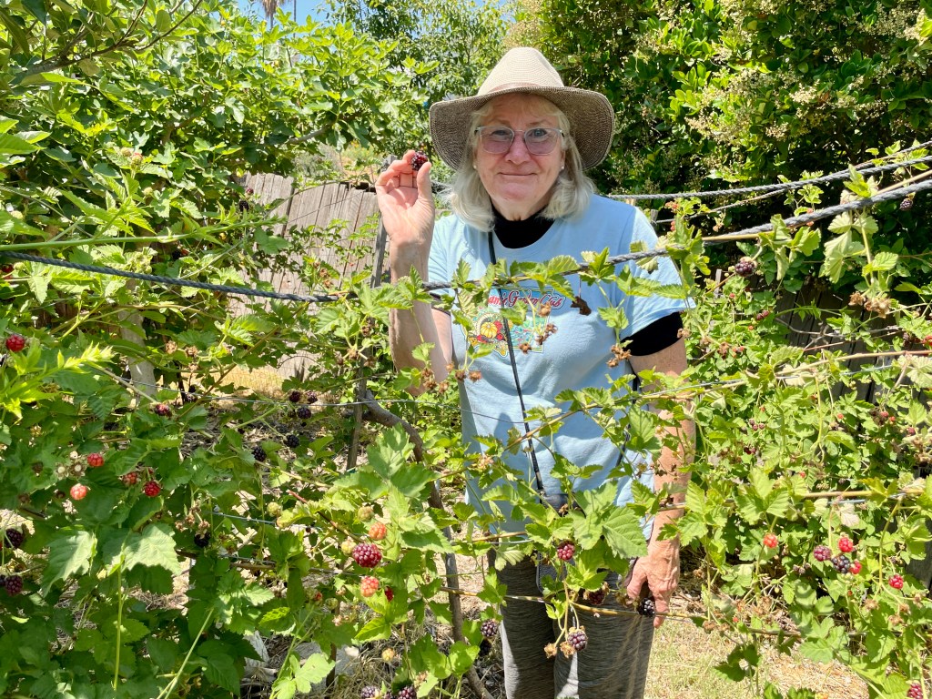 Sue invited us to pick and try a delicious organic boysenberry right from the vine! What a delight! She has trained her vines to grow on wires fan shaped and espaliered! Plus she has blackberries and a volunteer passion fruit vine. Her summer organic vegetable container garden is just beginning to grow.
