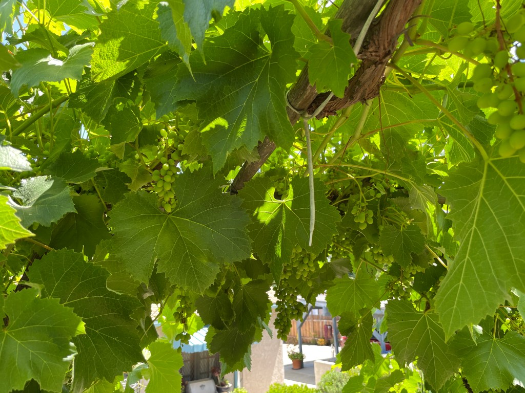 Her four grape vines are loaded with fruit, trellised on arches and structures. She suggested putting clamshell (grocery fruit) containers over our fruits to protect them from the birds and critters.