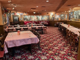 Menu: House bread, unlimited coffee, tea, and soft drinks. Caesar salad and mixed green salad, spaghetti marinara with veggies, cheese manicotti, chicken Limone, and chocolate chip cannoli.