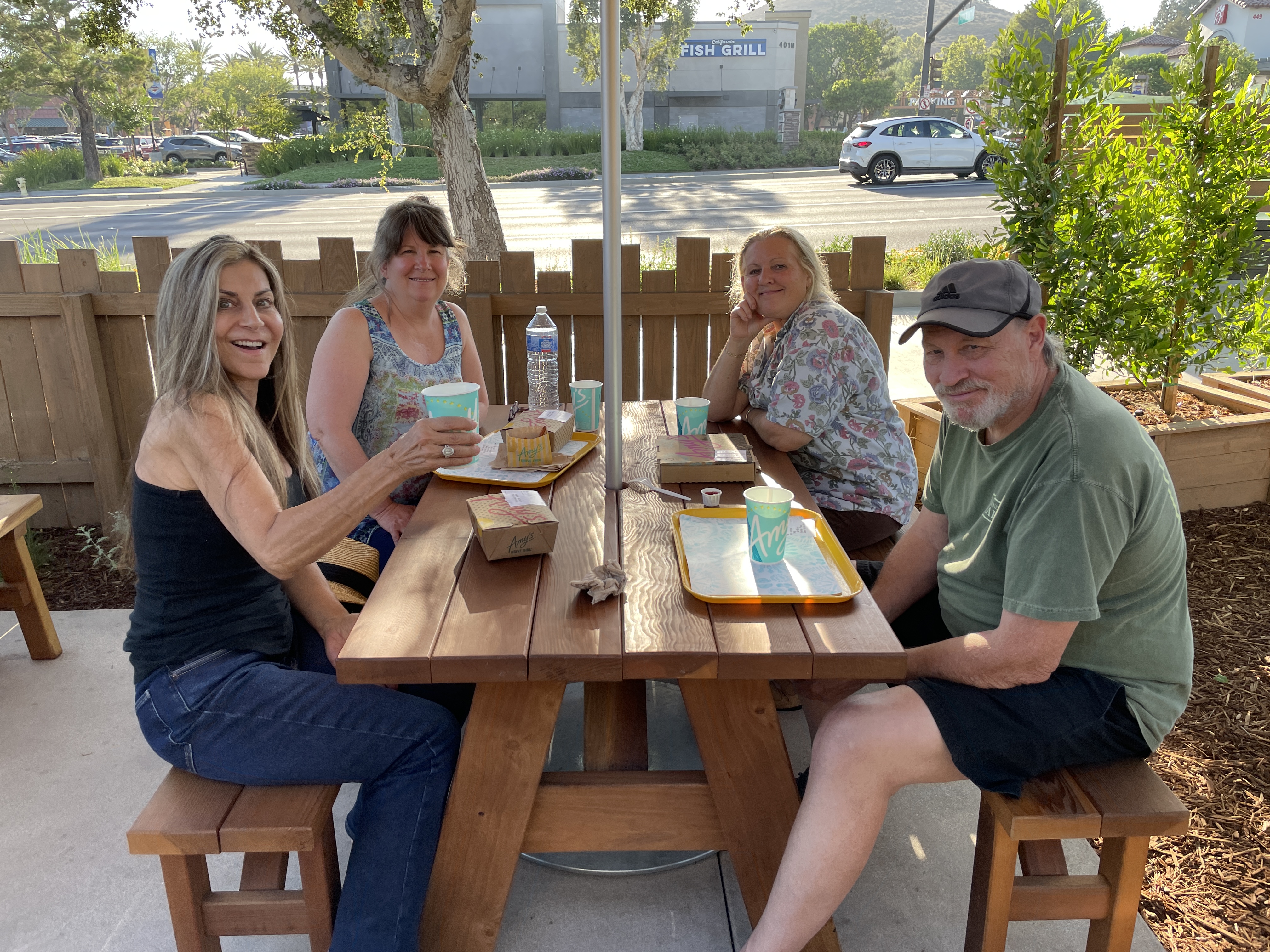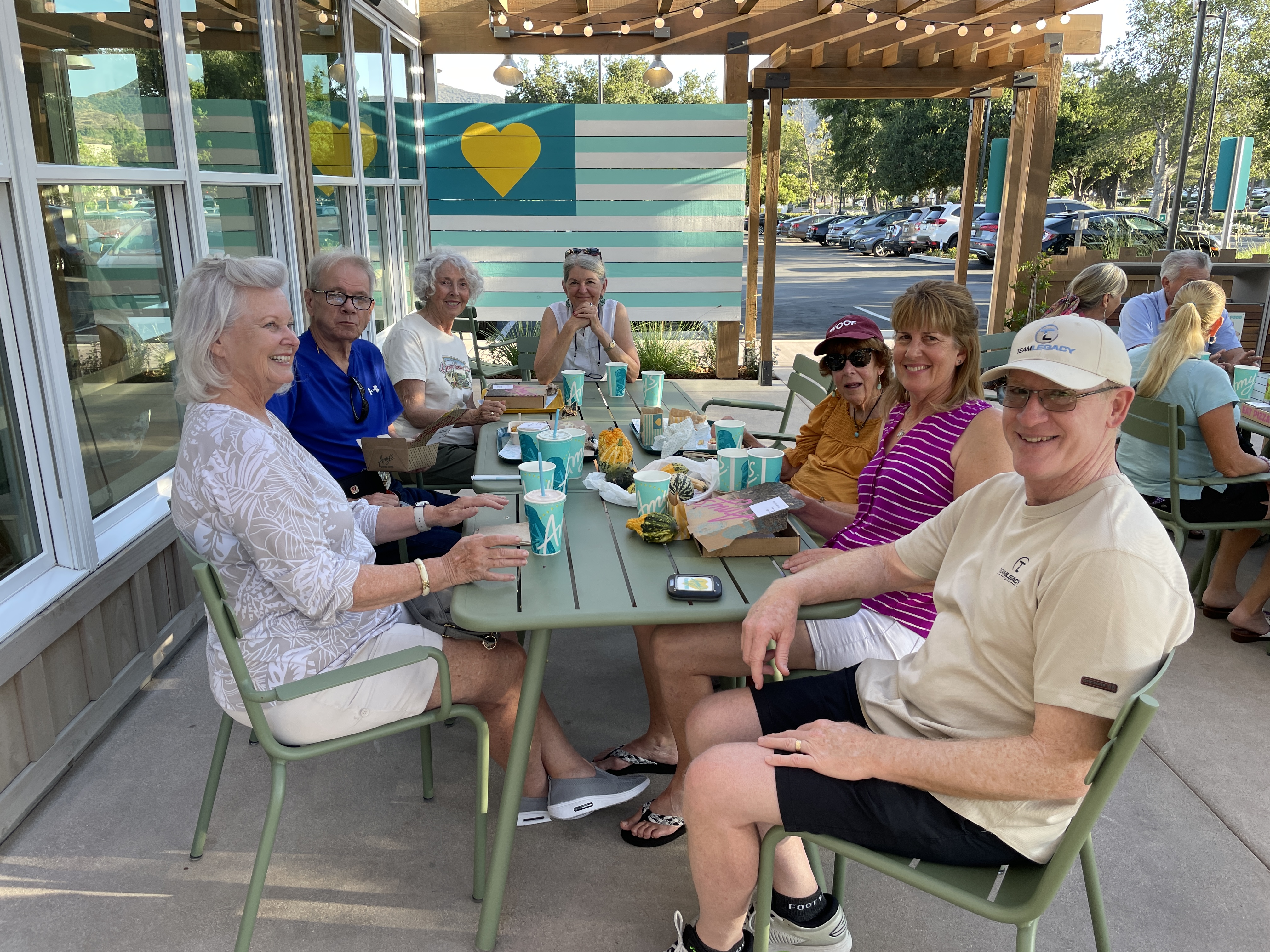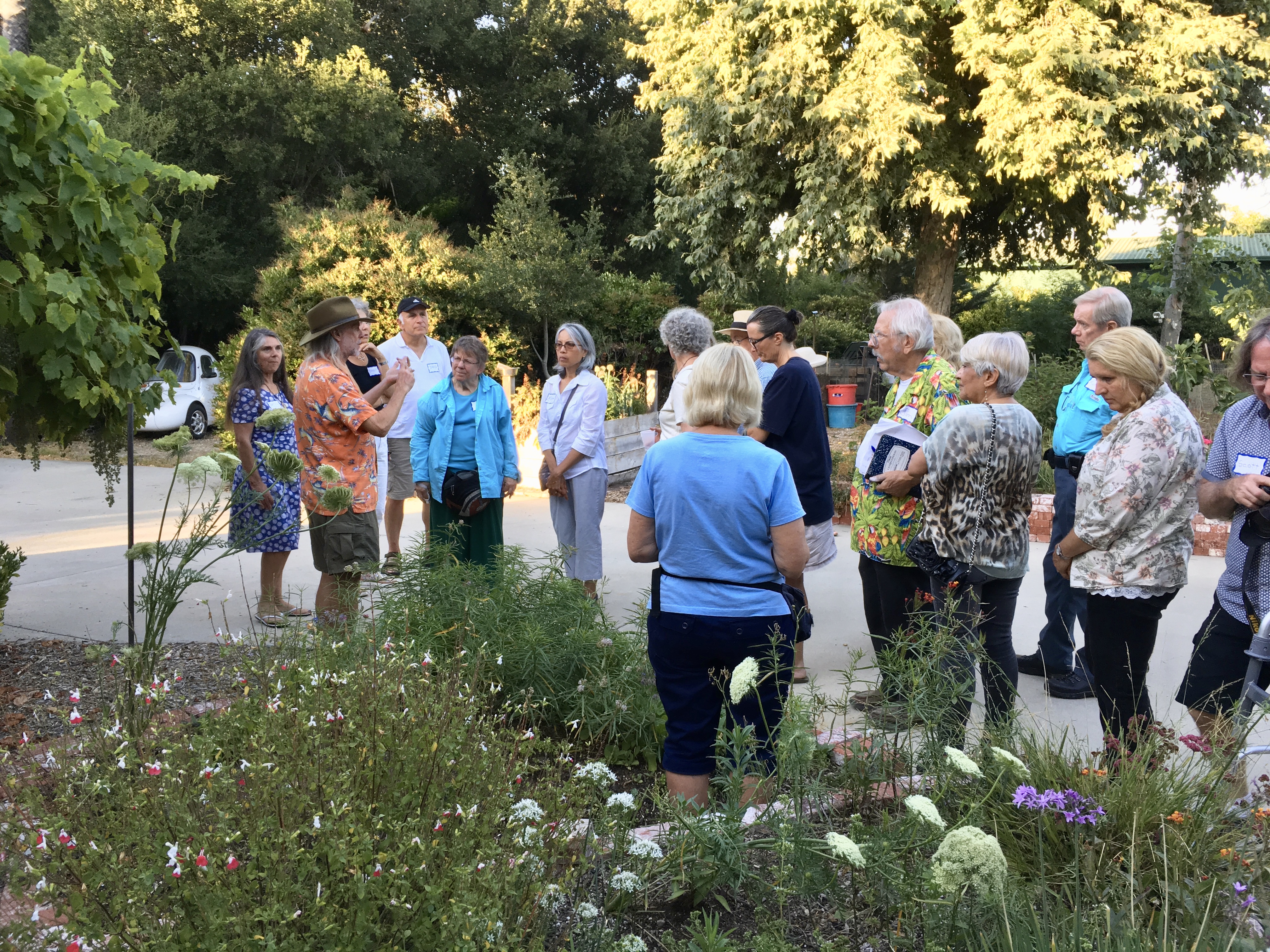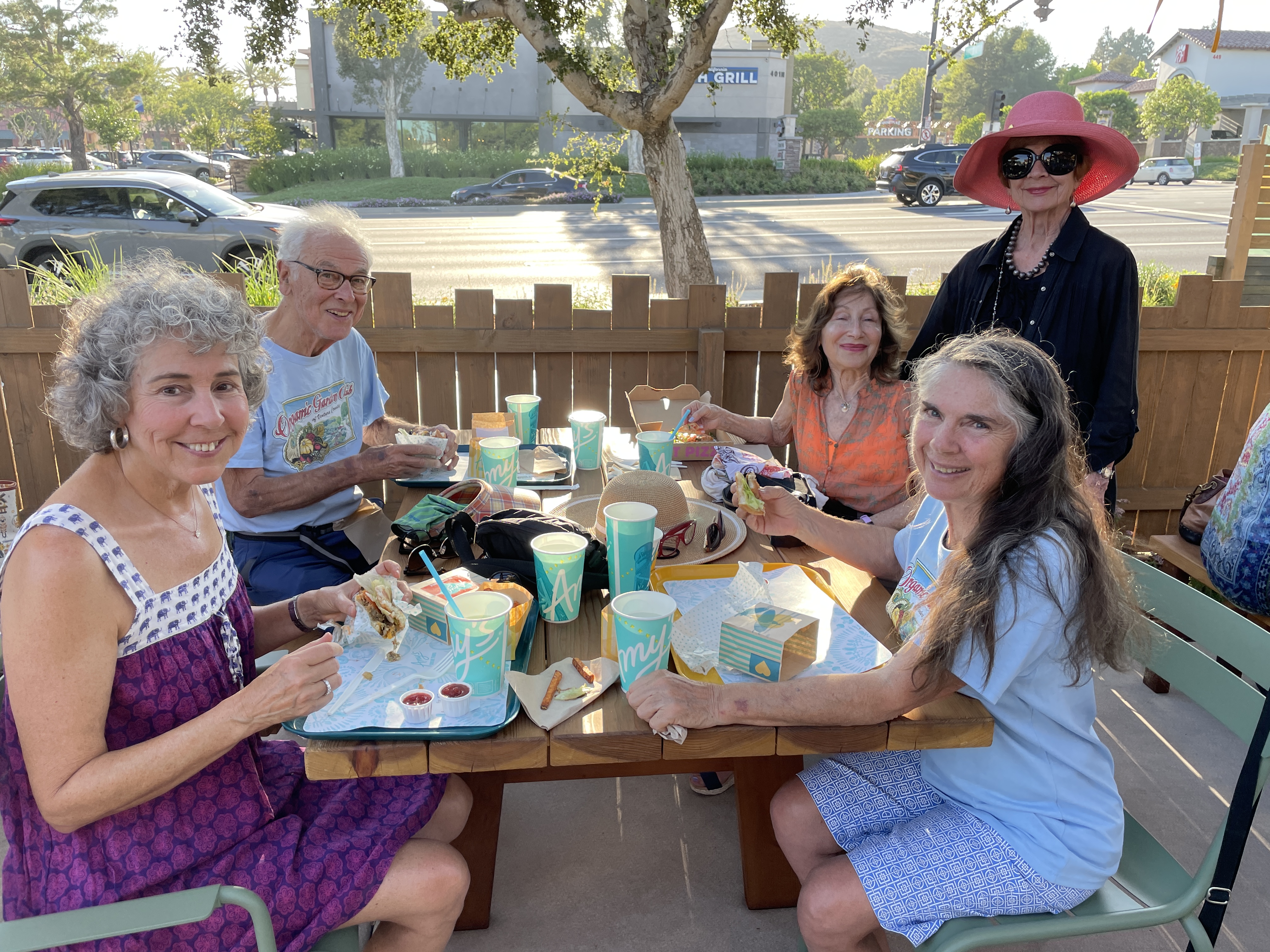 The Organic Garden Club had a fabulous Summer Party on the patio at Amy’s Cafe, an organic vegetarian cafe with gluten free and vegan options, from the creators of the prepared foods you can get at the grocery store. Organic Garden Club members are forward thinking organic regenerative gardeners interested in growing our own food and living sustainable lives. Many of us volunteer to help improve our local ecosystems and to help feed the hungry. Many members have backyard organic edible raised bed gardens, fruit trees, and native plant and permaculture landscaping with perennial herbs and veggies.